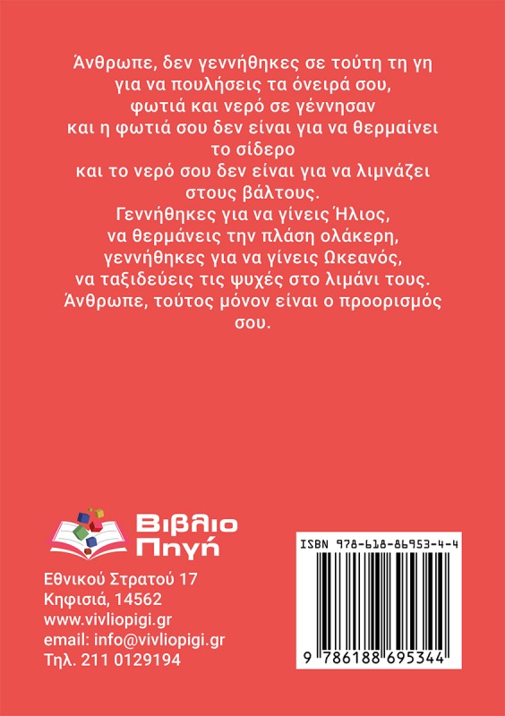 Άνθρωπε, δεν γεννήθηκες σε τούτη τη γη για να πουλήσεις τα όνειρά σου, φωτιά και νερό σε γέννησαν και η φωτιά σου δεν είναι για να θερμαίνει το σίδερο και το νερό σου δεν είναι για να λιμνάζει στους βάλτους. Γεννήθηκες για να γίνεις Ήλιος, να θερμάνεις την πλάση ολάκερη, γεννήθηκες για να γίνεις Ωκεανός, να ταξιδεύεις τις ψυχές στο λιμάνι τους. Άνθρωπε, τούτος μόνον είναι ο προορισμός σου.