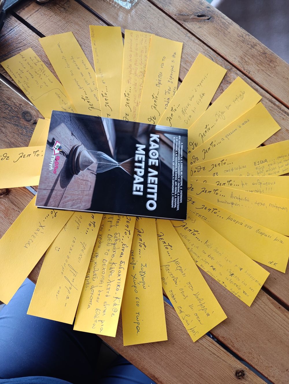 Ευχαριστούμε τον κόσμο που ήρθε, άκουσε, συζήτησε και μας πρόσφερε τόσο διαφορετικές και βαθιά αληθινές εκδοχές της αξίας των «λεπτών» και του χρόνου στα καρτελάκια στα οποία η κυρία Αλεξανδροπούλου τούς ζήτησε να καταθέσουν την προσωπική τους οπτική, συμπληρώνοντας τη φράση "Κάθε λεπτό..." σε μια μίνι συνεδρία δημιουργικής γραφής που έδωσε το βήμα στους παρευρισκόμενους και γέννησε ένα διάλογο γεμάτο ζωντάνια και δημιουργικότητα. Στην παρουσίαση διαβάστηκαν αποσπάσματα από το διήγημα της κας Αλεξανδροπούλου αλλά και από τα διηγήματα των υπόλοιπων 16 συγγραφέων που συγκίνησαν ιδιαίτερα τις ομιλήτριες.